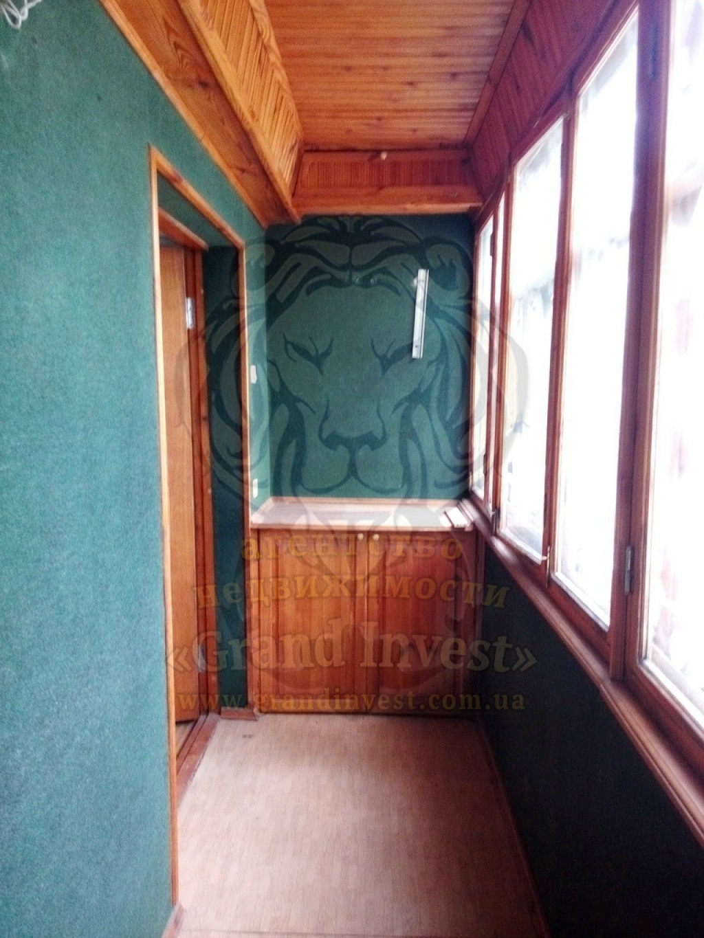 Лоджия обшита деревом и застеклена, кладовка.