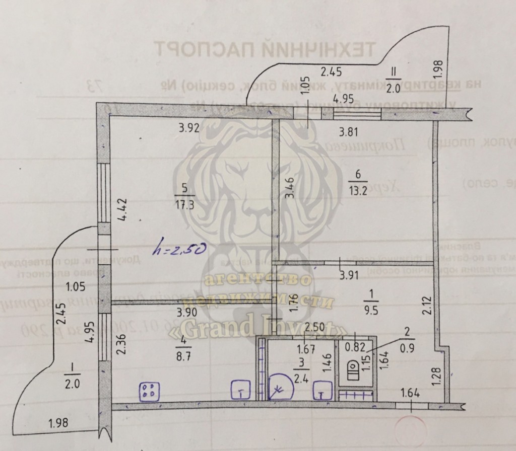 Общая площадь жилья 56м2, жилая 30,5, комнаты раздельные просторные 17.3 и 13.2 м2.